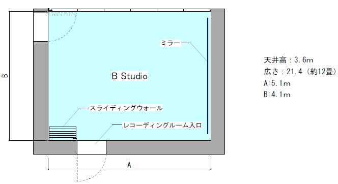 約12畳の空間は個人のソロ練習や伴奏合わせ、シンプルな編成の打楽器練習に最適です。