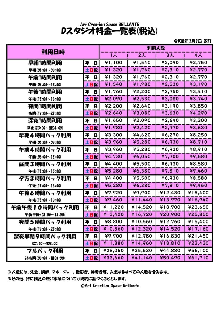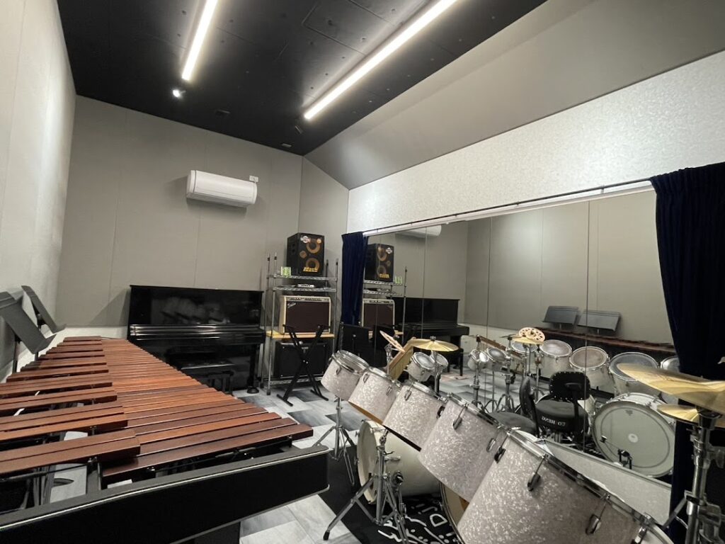 D Studio 2025.10.162025.12.30 多用途な音楽スタジオです。 概要 多用途な音楽空間です。バンド練習やパーカッションソロ練習など、幅広い用途でお使いいただけます。この部屋のみ残響が少なくクリアになっており、粒がはっきりと聞き取れます。アップライトピアノ・バンド用機材完備。 ※常設楽器:アップライトピアノ、ドラム、各種アンプ、マリンバ等。 使用料金